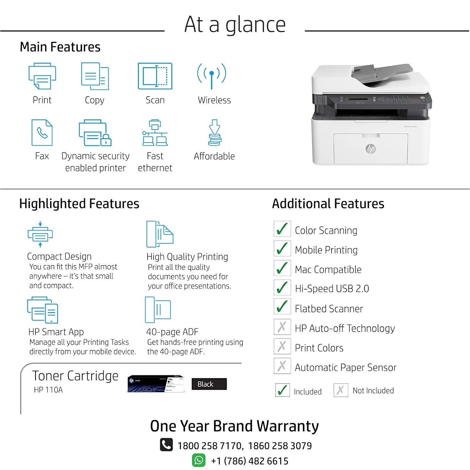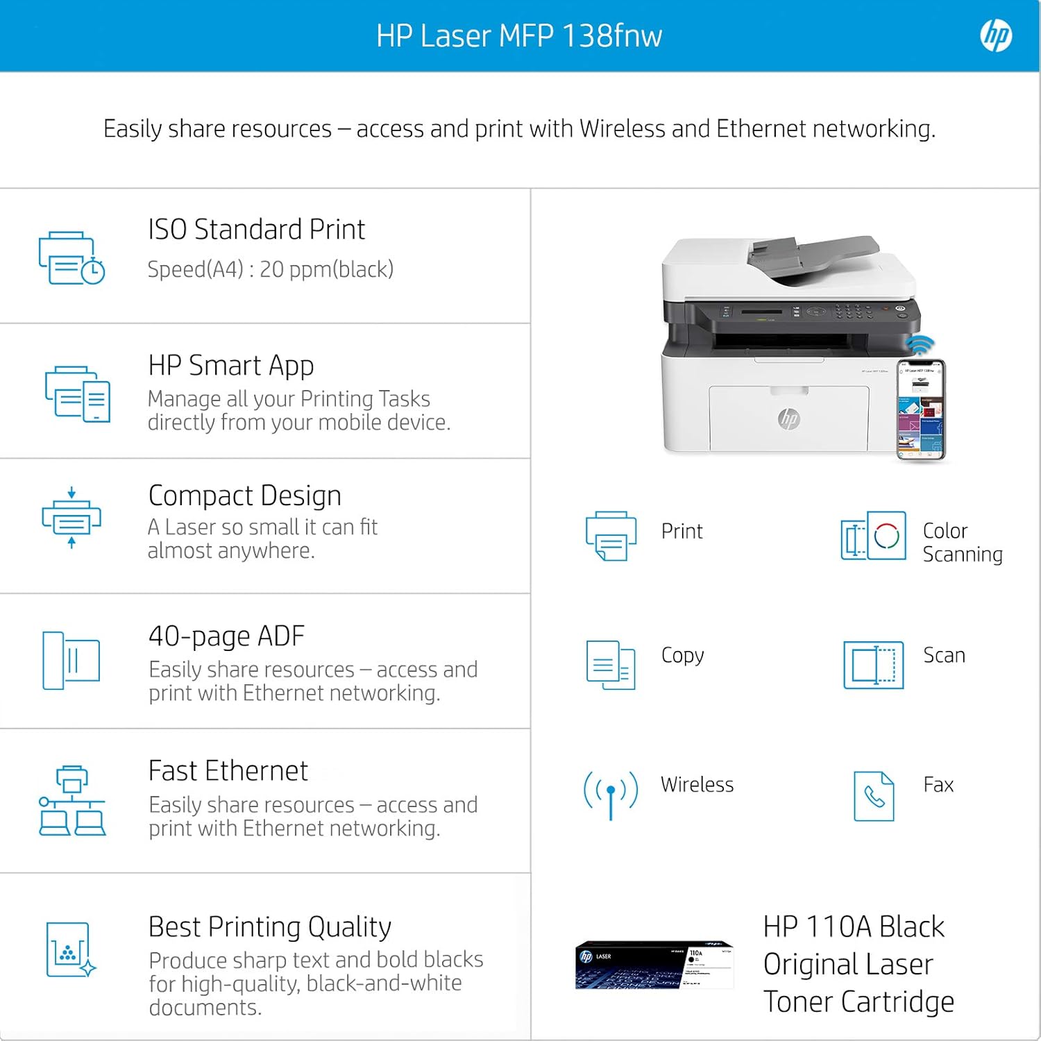 Features: • Printer Type - LaserJet; Functionality – Print,Scan,Copy,Fax Printer Output - Black & White only • Pages per minute - 20 pages.